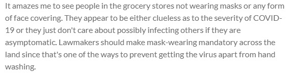 It amazes me to see people in the grocery stores not wearing masks or any form of face covering. They appear to be either clueless as to the severity of COVID-19 or they just don't care about possibly infecting others if they are asymptomatic. Lawmakers should make mask-wearing mandatory across the land since that's one of the ways to prevent getting the virus apart from hand washing.