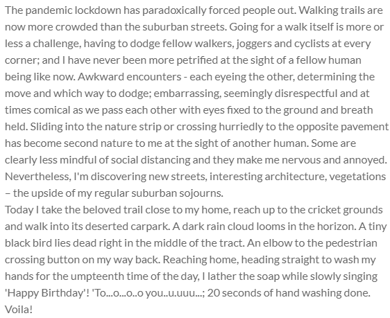 Today I take the beloved trail close to my home, reach up to the cricket grounds and walk into its deserted carpark. A dark rain cloud looms in the horizon. A tiny black bird lies dead right in the middle of the tract. An elbow to the pedestrian crossing button on my way back. Reaching home, heading straight to wash my hands for the umpteenth time of the day, I lather the soap while slowly singing 'Happy Birthday'! 'To...o...o..o you..u.uuu...; 20 seconds of hand washing done. Voila!