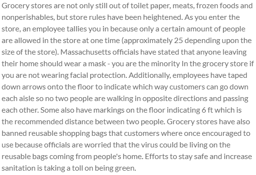 Grocery stores are not only still out of toilet paper, meats, frozen foods and nonperishables, but store rules have been heightened. As you enter the store, an employee tallies you in because only a certain amount of people are allowed in the store at one time (approximately 25 depending upon the size of the store). Massachusetts officials have stated that anyone leaving their home should wear a mask - you are the minority In the grocery store if you are not wearing facial protection. Additionally, employees have taped down arrows onto the floor to indicate which way customers can go down each aisle so no two people are walking in opposite directions and passing each other. Some also have markings on the floor indicating 6 ft which is the recommended distance between two people. Grocery stores have also banned reusable shopping bags that customers where once encouraged to use because officials are worried that the virus could be living on the reusable bags coming from people's home. Efforts to stay safe and increase sanitation is taking a toll on being green.