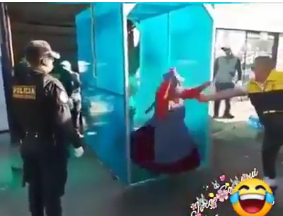 A citizen of Puno entered dancing to a COVID-19 disinfection booth, probably entered to do shopping or work as she heads into the market. At the time of check-in, she decided to do a little dance that caused laughter for the people around her. She seemed happy and humorous in spite of the critical situation that the world brings with the coronavirus.