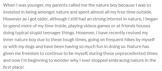 When I was younger, my parents called me the nature boy because I was so invested in being amongst nature and spent almost all my free time outside. However as I got older, although I still had an strong interest in nature, I began to spend more of my time inside, playing videos games or at friends houses doing typical stupid teenager things. However, I have recently revived my inner nature boy due to these tough times, going on frequent hikes by myself or with my dogs and have been having so much fun in doing so. Nature has given me freedom to continue to be myself, during these unprecedented times and now I'm beginning to wonder why I ever stopped embracing nature in the first place!