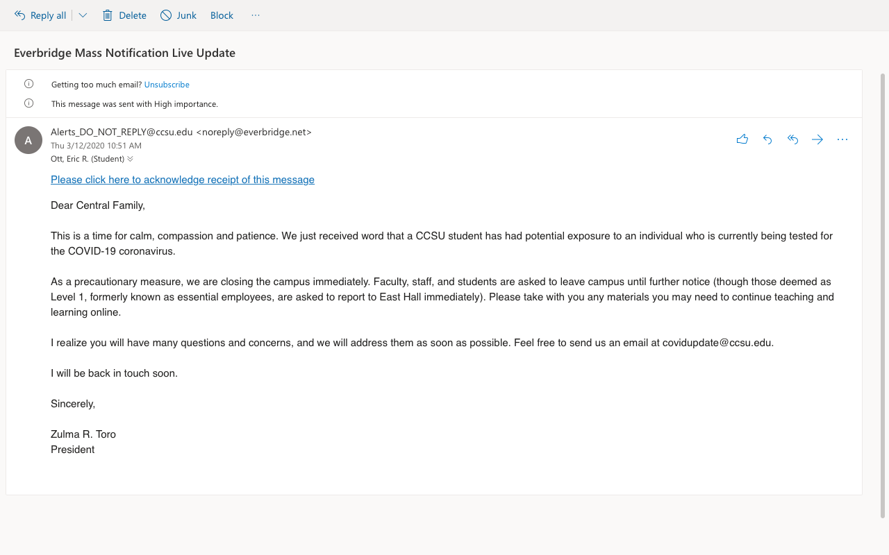 This one email changed everything. Every student and staff member at Central Connecticut State University received this email from the President of the University, Zulma Toro. In it, she describes the possibility that a student at the university might have been infected with the virus and that she has closed the campus because of the danger. Almost every university student around the country has some sort of email like this and it was one of the most frightening emails we've ever received in our lives. It changed everything. Students were forced to leave campus in two hours and left many of their belongings behind. Those items left in the dorm rooms are now being packed up and moved to storage containers as CT National Guard Troopers and Medical Staff are staying in the empty dorms to support efforts to fight the pandemic. All classes were canceled and shifted to online learning for the rest of the semester. In one quick email students were deprived of relationships with friends and staff and thrust into a world of unknowns. Some students who relied on campus housing and food were left homeless and without basic means to support themselves. All in the space fo two hours. Before this email, you could say Coronavirus was just something in the news that didn't effect our lives, but after this email, we all got a dose of reality. We couldn't live our lives the same way anymore. The ignorance was gone.