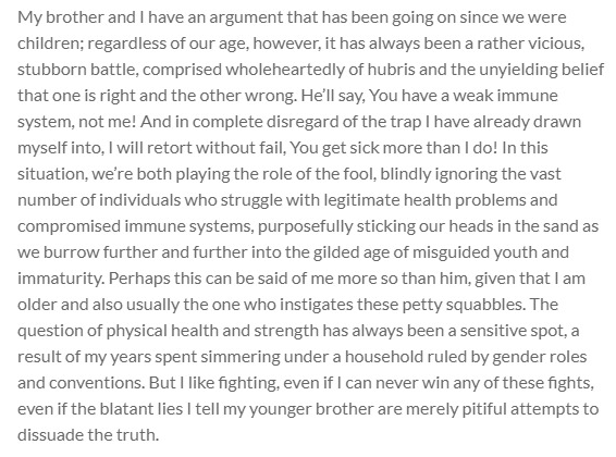 My brother and I have an argument that has been going on since we were children; regardless of our age, however, it has always been a rather vicious, stubborn battle, comprised wholeheartedly of hubris and the unyielding belief that one is right and the other wrong. He’ll say, You have a weak immune system, not me! And in complete disregard of the trap I have already drawn myself into, I will retort without fail, You get sick more than I do! In this situation, we’re both playing the role of the fool, blindly ignoring the vast number of individuals who struggle with legitimate health problems and compromised immune systems, purposefully sticking our heads in the sand as we burrow further and further into the gilded age of misguided youth and immaturity. Perhaps this can be said of me more so than him, given that I am older and also usually the one who instigates these petty squabbles. The question of physical health and strength has always been a sensitive spot, a result of my years spent simmering under a household ruled by gender roles and conventions. But I like fighting, even if I can never win any of these fights, even if the blatant lies I tell my younger brother are merely pitiful attempts to dissuade the truth.