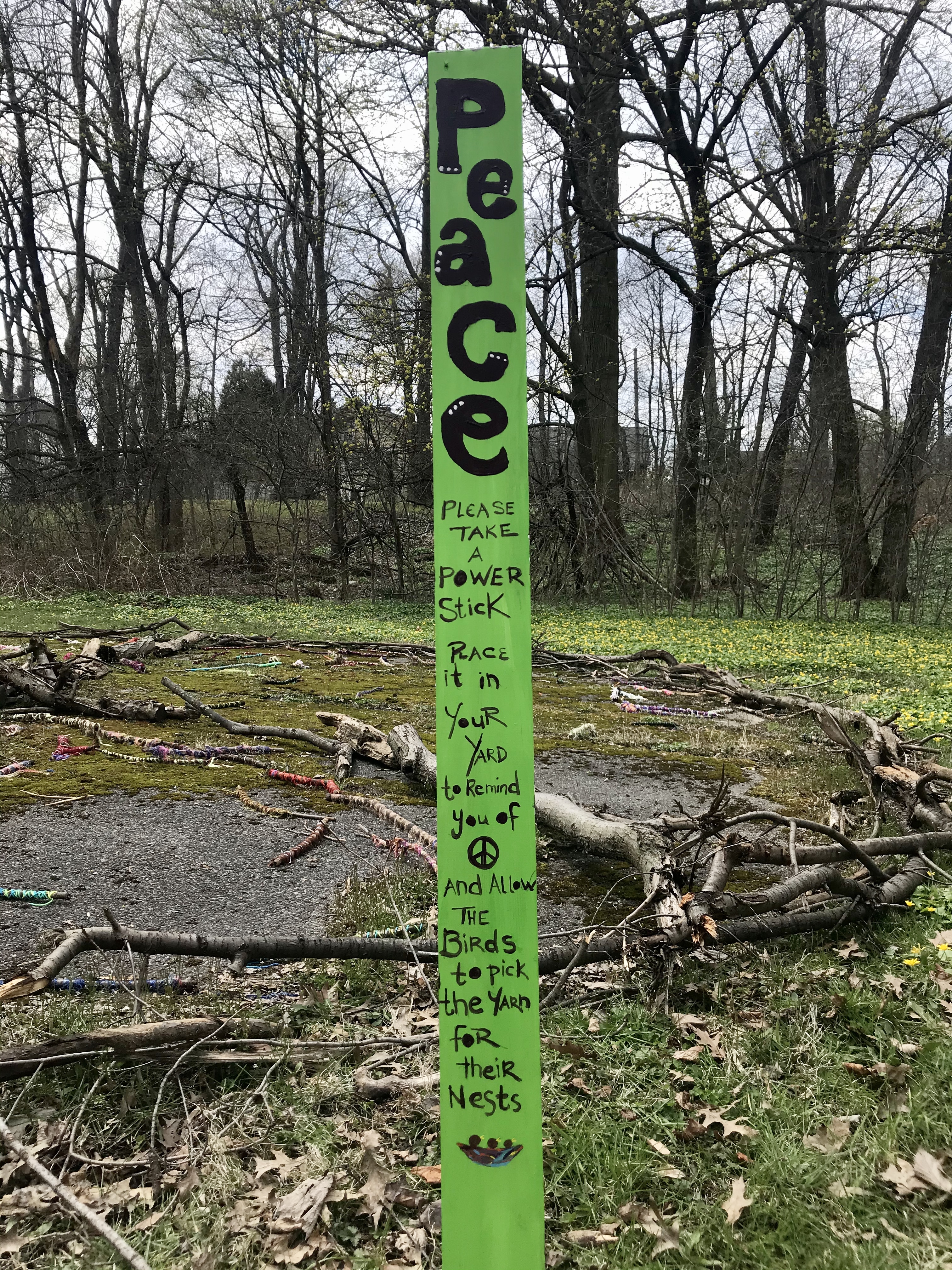This post describes an activity related to the peace sign behind it. The post reads "Peace. Please take a power stick. Place it in your yard to remind you of [peace sign] and allow the birds to pick the yarn for their nests." To my mind, this community project shows the need to take actions to combat a sense of futility. Parks are more important than ever in this time when walking outside is one of the only safe ways to be outdoors. It's nice to see the community making an intentional, active use of this park.