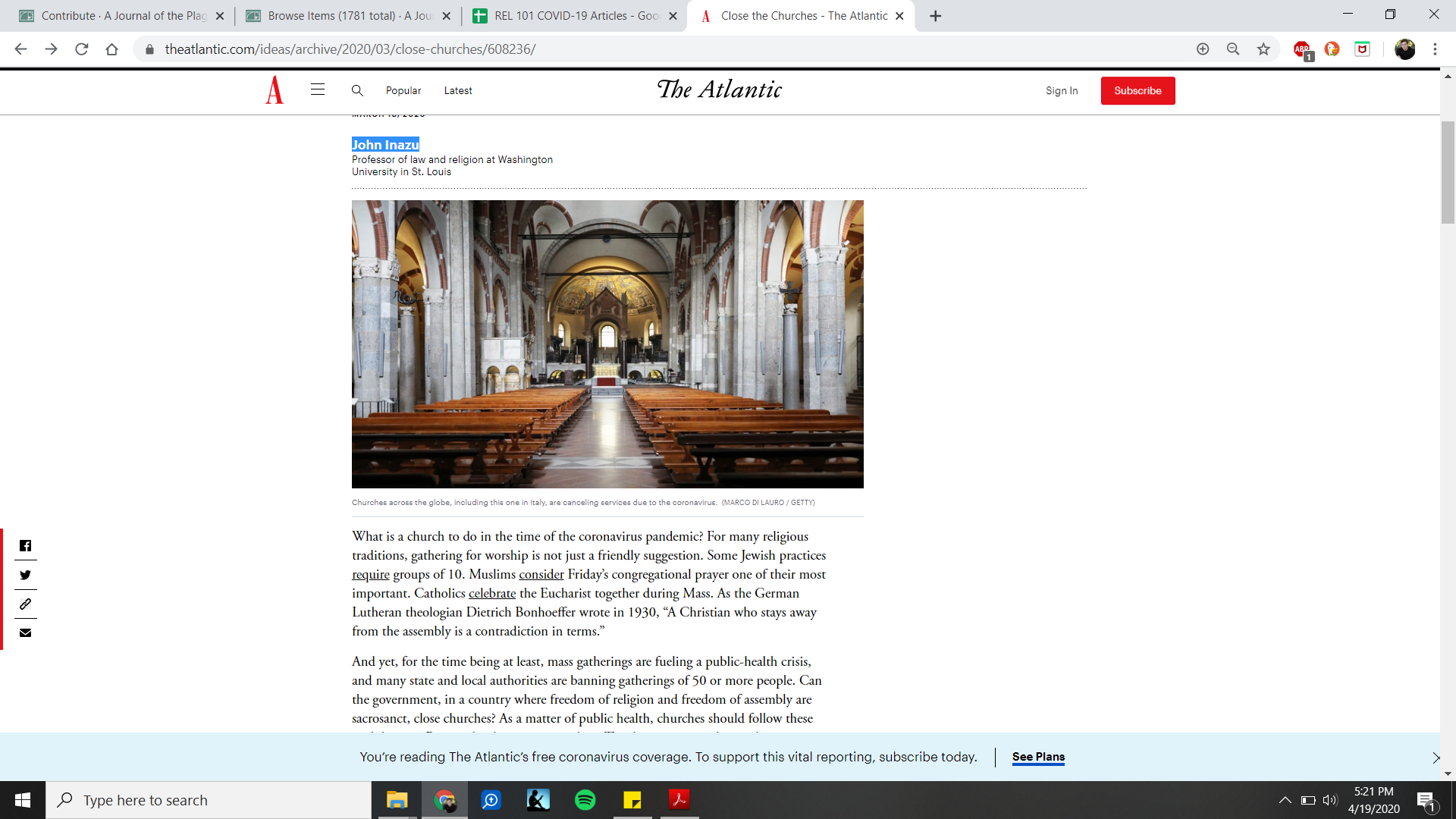 Churches have had to close worldwide due to the COVID-19 pandemic. For many religions, there is a necessity to get together in groups, worship together, and even celebrate religious events. Due to these restrictions, many are now having their right of practicing religion taken away from them. There are legal actions that have been taken in the past, when considering if churches should listen and follow state or federal claims.