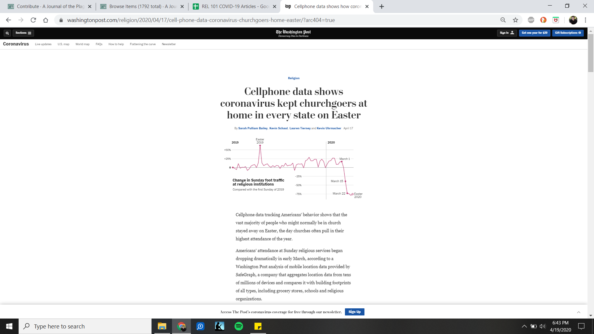This article shows statistically how many Americans listened to their government pertaining to "stay-at-home orders" over Easter weekend through the use of cellphone data. The highest drop of attendance occurred in Georgia with a decrease in attendance by 90%. The article also talks about alternative methods to in-person church services. One method was by hosting an online version that churchgoers could log on to; however, this was found to be difficult to some of the older people. Another method used in West Virginia was allowing people to park in the parking lot of the church and having drive-in service where no one was allowed out of their car.
