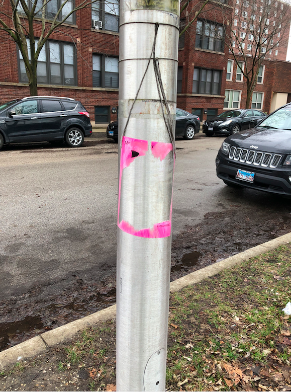 The remnants of a flyer taped to a lamp post in Chicago's Hyde Park neighborhood, advertising a rent strike against MAC Properties, one of Hyde Park's biggest leasing companies. Before being mostly ripped down, the flyer read "MAC tenants, organized" and included an image of an apartment building with the words "keep your rent, April 1."