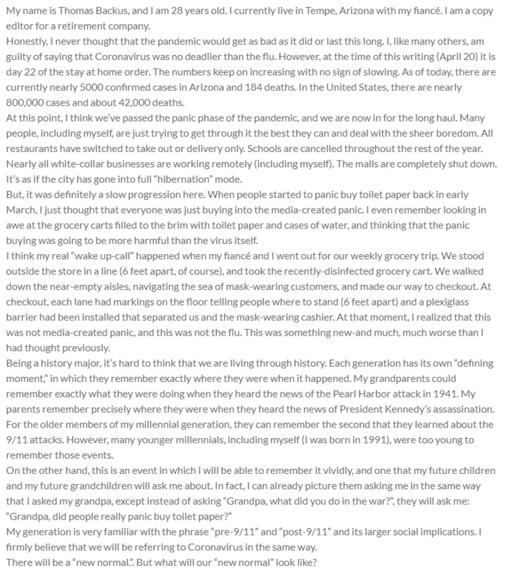 Honestly, I never thought that the pandemic would get as bad as it did or last this long. I, like many others, am guilty of saying that Coronavirus was no deadlier than the flu. However, at the time of this writing (April 20) it is day 22 of the stay at home order. The numbers keep on increasing with no sign of slowing. As of today, there are currently nearly 5000 confirmed cases in Arizona and 184 deaths. In the United States, there are nearly 800,000 cases and about 42,000 deaths.