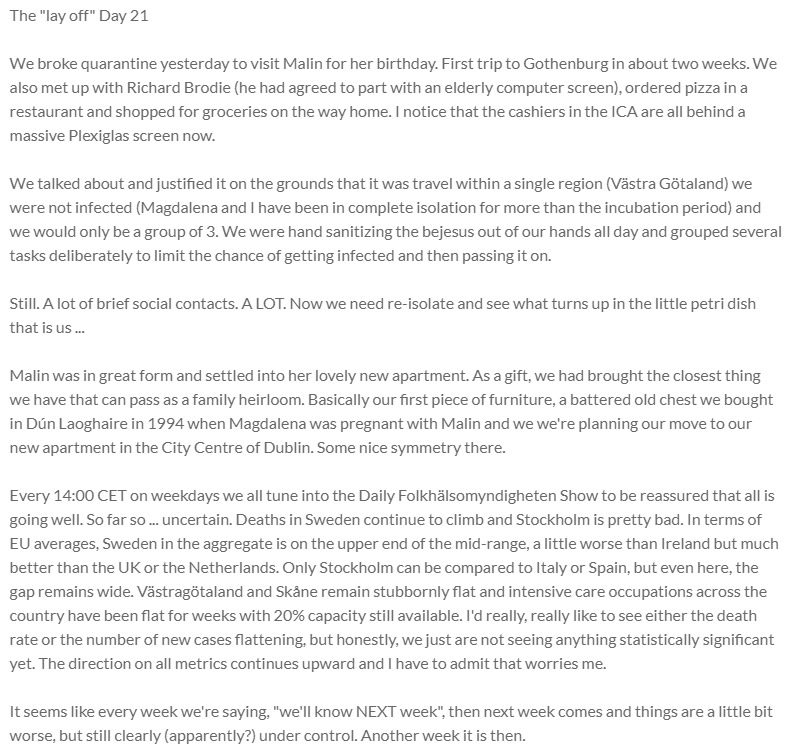 We broke quarantine yesterday to visit Malin for her birthday. First trip to Gothenburg in about two weeks. We also met up with Richard Brodie (he had agreed to part with an elderly computer screen), ordered pizza in a restaurant and shopped for groceries on the way home. I notice that the cashiers in the ICA are all behind a massive Plexiglas screen now.