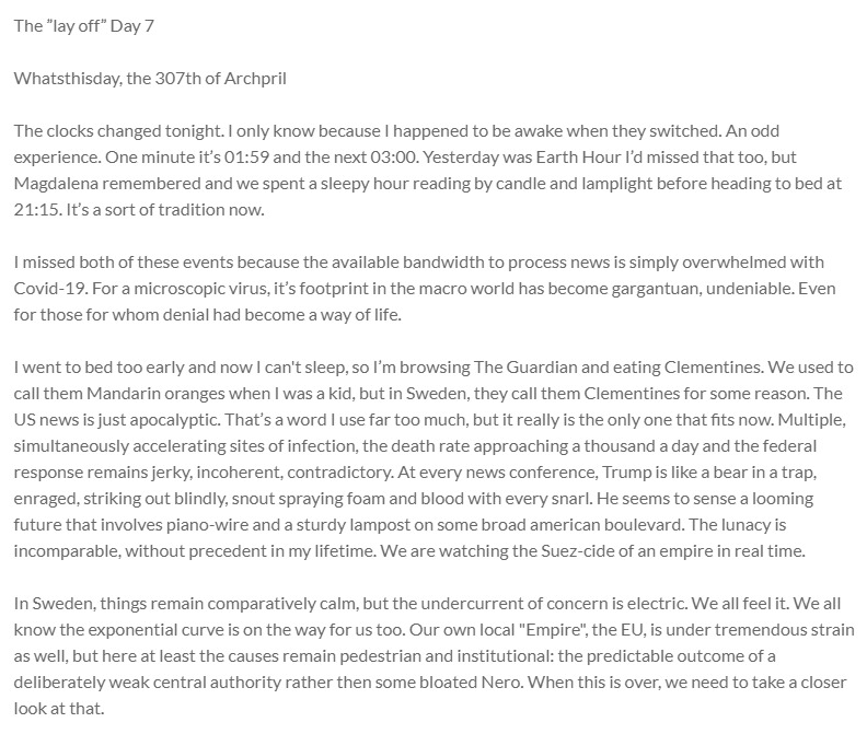In Sweden, things remain comparatively calm, but the undercurrent of concern is electric. We all feel it. We all know the exponential curve is on the way for us too. Our own local "Empire", the EU, is under tremendous strain as well, but here at least the causes remain pedestrian and institutional: the predictable outcome of a deliberately weak central authority rather then some bloated Nero. When this is over, we need to take a closer look at that.