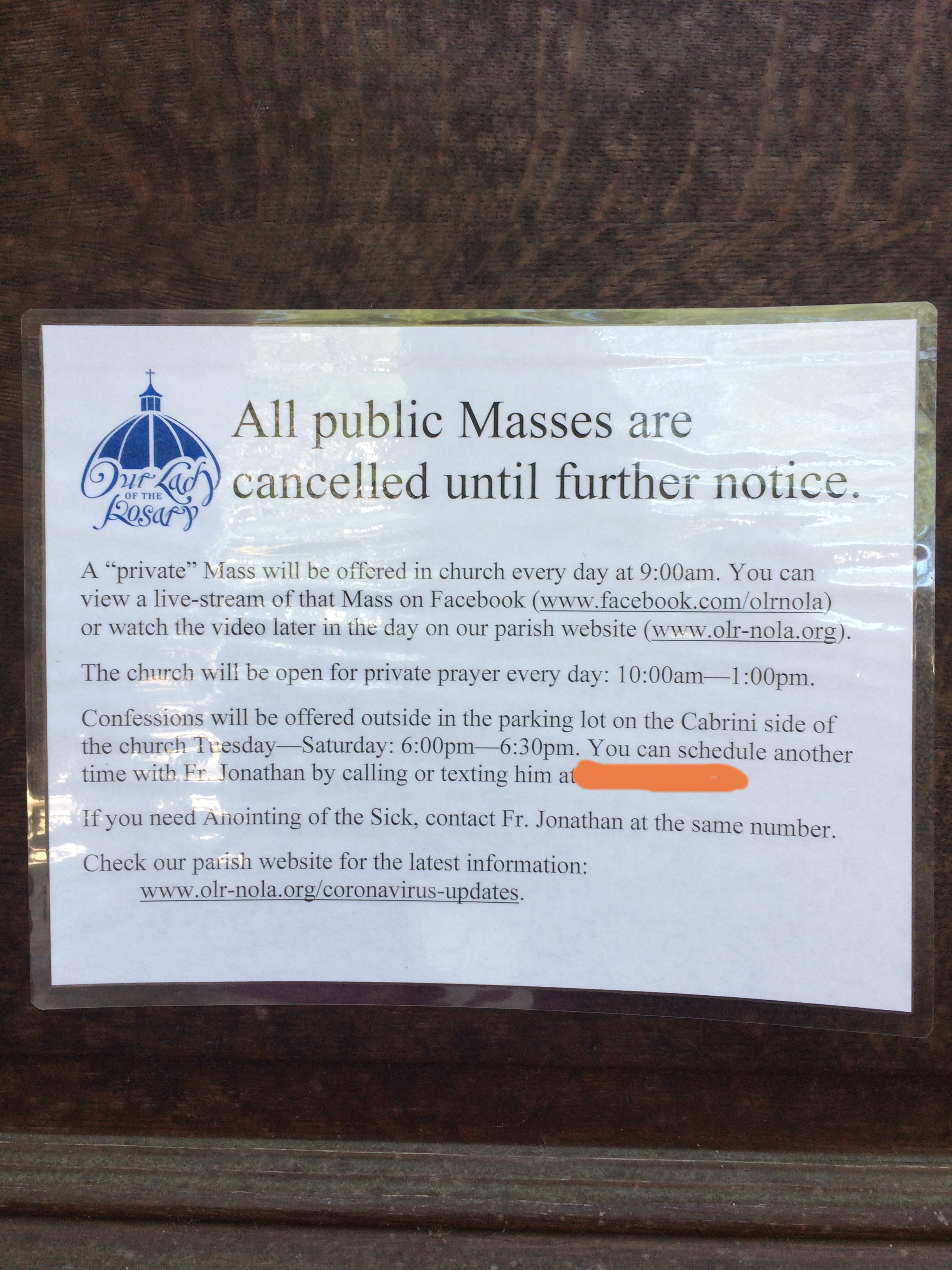 A sign on the door of Our Lady of the Rosary Roman Catholic Church reads: "All public Masses are cancelled until further notice. A "private" Mass will be offered in church everyday at 9:00am. You can view a live-stream of that Mass on Facebook (www.facebook.com/olrnola) or watch the video later in the day on our parish website (www.olr-nola.org). The church will be open for private prayer every day: 10:00 am - 1:00 pm. Confessions will be offered outside in the parking lot on the Cabrini side of the church Tuesday - Saturday: 6:00pm - 6:30pm. You can schedule another time with Fr. Jonathan by calling or texting him at [###-###-####]. If you need an Anointing of the Sick, contact Fr. Jonathan at the same number.