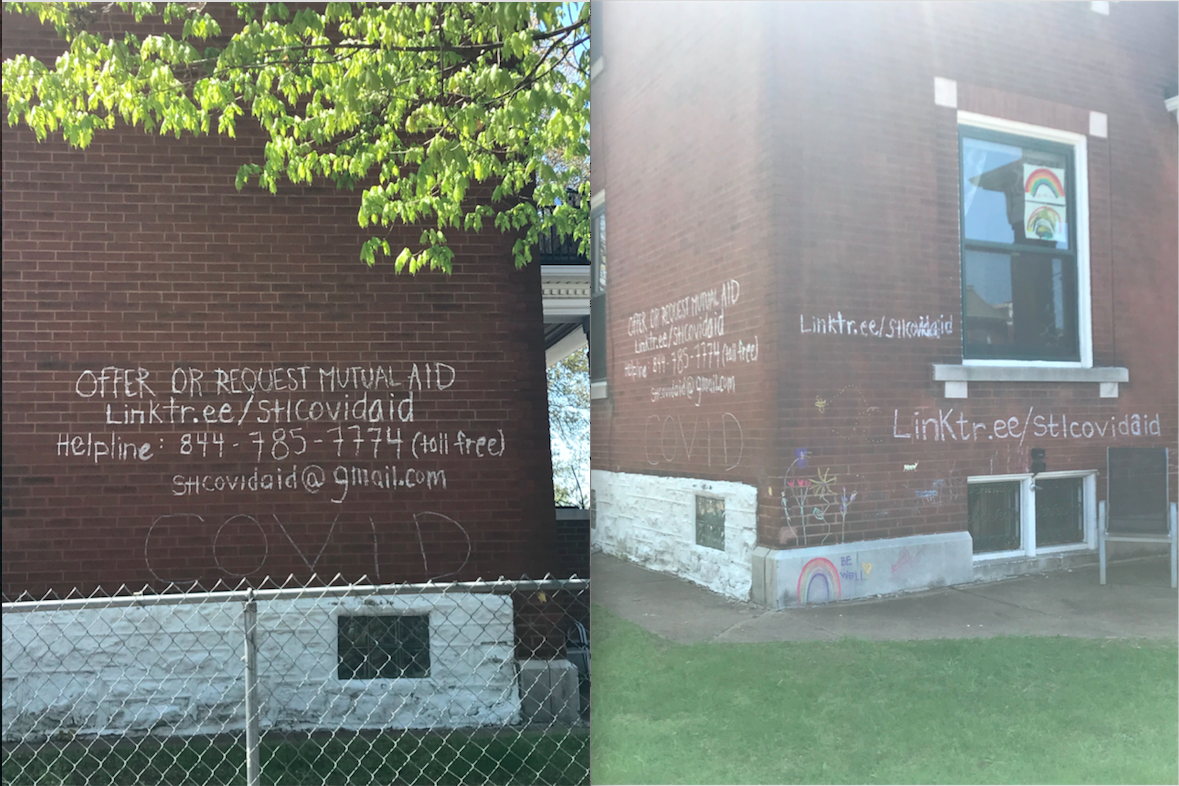 The South City area of Saint Louis is a diverse, tight-knit community. It only makes sense that residents would go out of their way to assist each other during this difficult time. The residents of this home near the intersection of Arsenal St. and Gravois Rd. advertised resources in chalk writing on the exterior of the house, including a LinkTree website, toll-free helpline, and email account dedicated to helping those in need and connecting volunteers with service opportunities. There are also children’s chalk drawings of flowers and a rainbow on the exterior and of a rainbow and a pot of gold taped to the window. #DePaulHST391