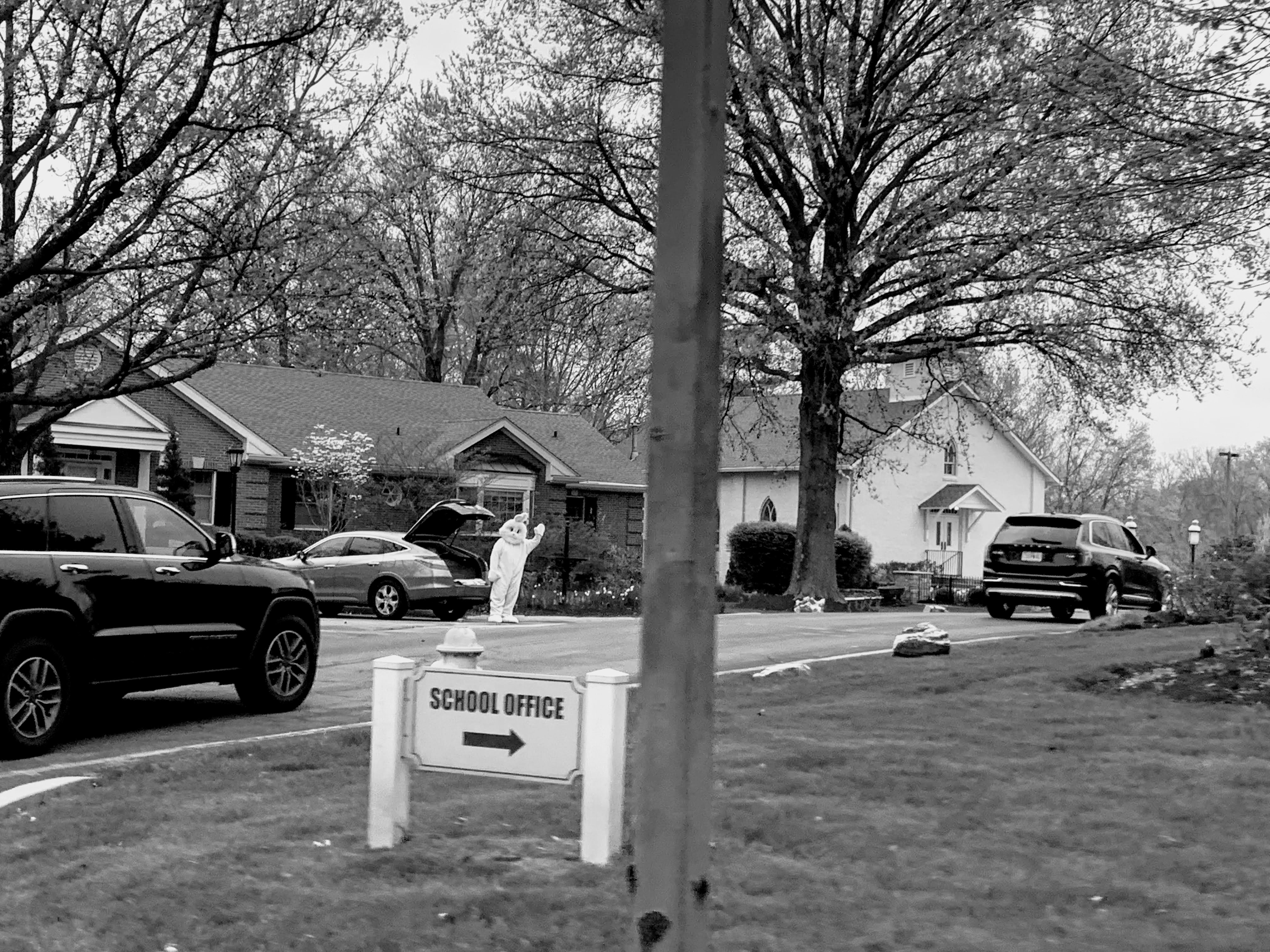 The local church near my parents' house in Chesterfield, MO (where I'm currently quarantined) had a drive-thru style blessing on Easter Sunday. After a priest stood a good 6 feet back and sprinkled holy water on our car, we were directed to exit past a costumed Easter Bunny who waved as the cars left. I snapped this photo from the back seat. To me, the photo is a symbol of hope and human optimism in the face of a crisis, however, at the time of taking it, it struck me as more sad and detached. Something about an Easter Bunny standing outside his car with the trunk open just struck a chord.