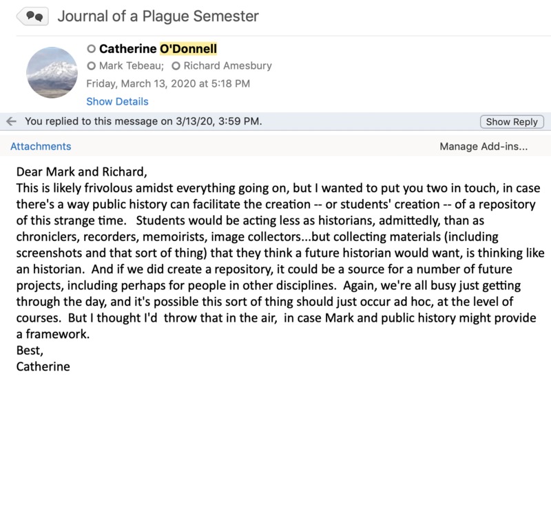 This is likely frivolous amidst everything going on, but I wanted to put you two in touch, in case there's a way public history can facilitate the creation -- or students' creation -- of a repository of this strange time. Students would be acting less as historians, admittedly, than as chroniclers, recorders, memoirists, image collectors...but collecting materials (including screenshots and that sort of thing) that they think a future historian would want, is thinking like an historian. And if we did create a repository, it could be a source for a number of future projects, including perhaps for people in other disciplines. Again, we're all busy just getting through the day, and it's possible this sort of thing should just occur ad hoc, at the level of courses. But I thought I'd throw that in the air, in case Mark and public history might provide a framework.