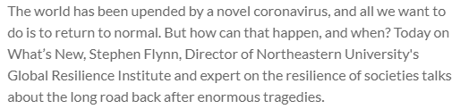 The world has been upended by a novel coronavirus, and all we want to do is to return to normal. But how can that happen, and when? Today on What’s New, Stephen Flynn, Director of Northeastern University's Global Resilience Institute and expert on the resilience of societies talks about the long road back after enormous tragedies.