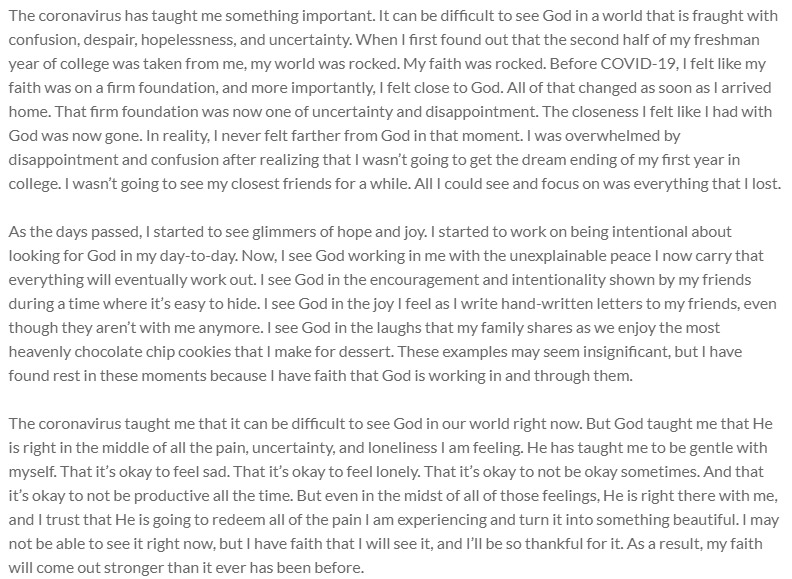 The coronavirus has taught me something important. It can be difficult to see God in a world that is fraught with confusion, despair, hopelessness, and uncertainty. When I first found out that the second half of my freshman year of college was taken from me, my world was rocked. My faith was rocked. Before COVID-19, I felt like my faith was on a firm foundation, and more importantly, I felt close to God. All of that changed as soon as I arrived home. That firm foundation was now one of uncertainty and disappointment. The closeness I felt like I had with God was now gone. In reality, I never felt farther from God in that moment. I was overwhelmed by disappointment and confusion after realizing that I wasn’t going to get the dream ending of my first year in college. I wasn’t going to see my closest friends for a while. All I could see and focus on was everything that I lost.