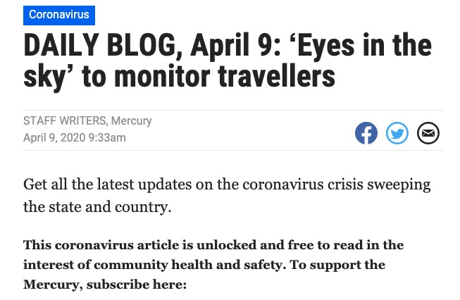 The Mercury (online) published on its daily coronavirus blog an article entitled, “'Eyes in the sky' to monitor travellers.” The article informed the public that helicopters would be used over the coming Easter long weekend to ensure Tasmanians were adhering to social distancing and lockdown laws.