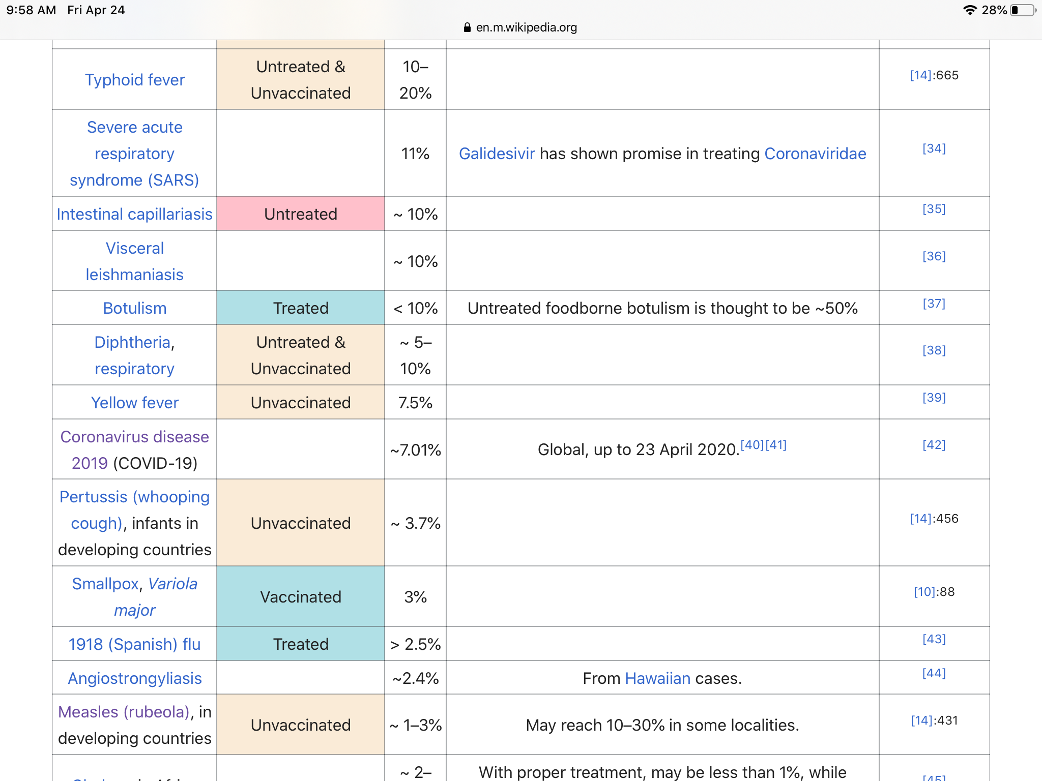 When I first came across this Wikipedia entry in January of 2020, the death rate for COVID-19 was below that of the Spanish flu. Day by day it has been creeping inexorably up.