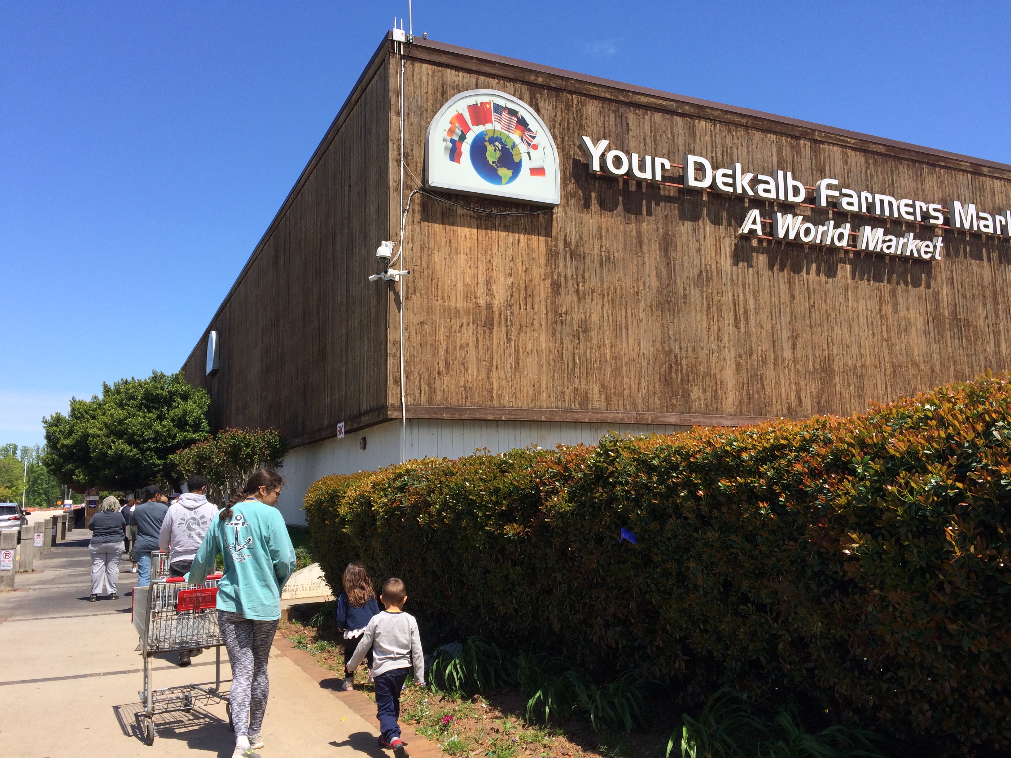 This image shows a line of shoppers located approximately six feet apart outside Your Dekalb Farmers Market in Scottdale, Georgia. Most shoppers were wearing masks, but the woman with the two children in front of the author went maskless. Everyone seemed stressed. A masked security guard let in new shoppers only when other left the store.