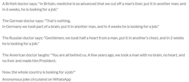 The American doctor laughs: "You are all behind us. A few years ago, we took a man with no brain, no heart, and no liver and made him President.