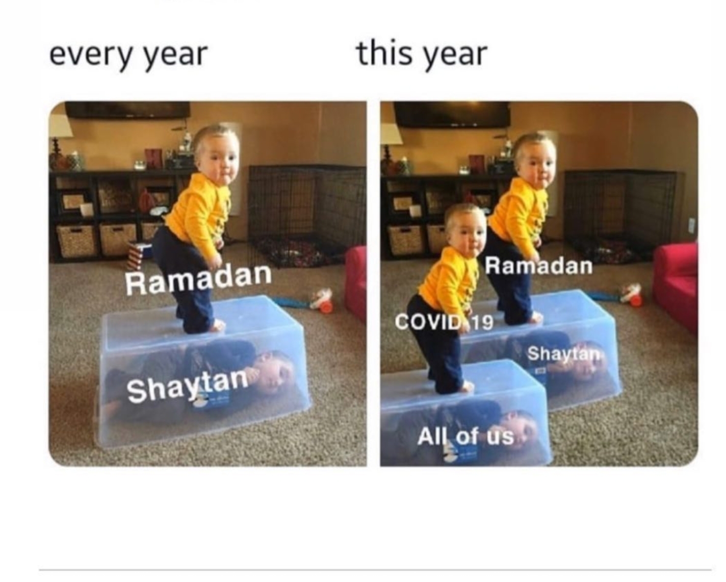 In the Muslim month of Ramadan, it is believed that the Devil a.k.a. Shaytaan or Satan is locked up, thus making the month of fasting easier for the individual Muslims to spiritually progress and develop their character since they only have to battle with their inner self and its desires. These meme comments on the fact that just like Satan is locked up during Ramadan, all Muslims have been locked up due to COVID-19.