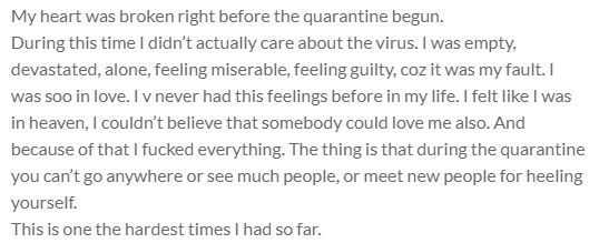 During this time I didn’t actually care about the virus. I was empty, devastated, alone, feeling miserable, feeling guilty, coz it was my fault. I was soo in love. I v never had this feelings before in my life. I felt like I was in heaven, I couldn’t believe that somebody could love me also. And because of that I fucked everything. The thing is that during the quarantine you can’t go anywhere or see much people, or meet new people for heeling yourself.