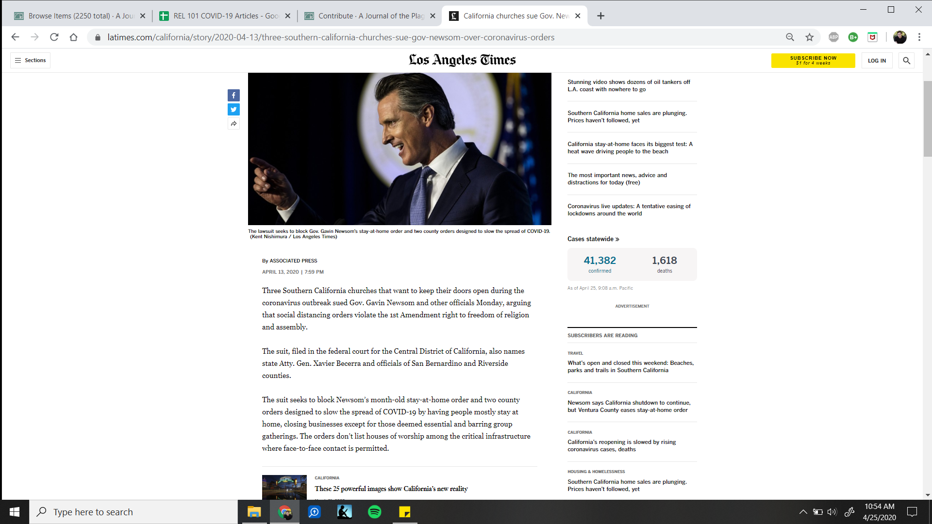 Three Southern California churches filed a law suit against California Governor Gavin Newsom and other government officials’ due to the stay-at home order. The churches are “arguing that social distancing orders violate the 1st Amendment right to freedom of religion and assembly”. Church officials state that they can practice the same social distancing manners that occur in grocery stores and other outlets. The article also mentions that similar lawsuits are occurring across the nation.