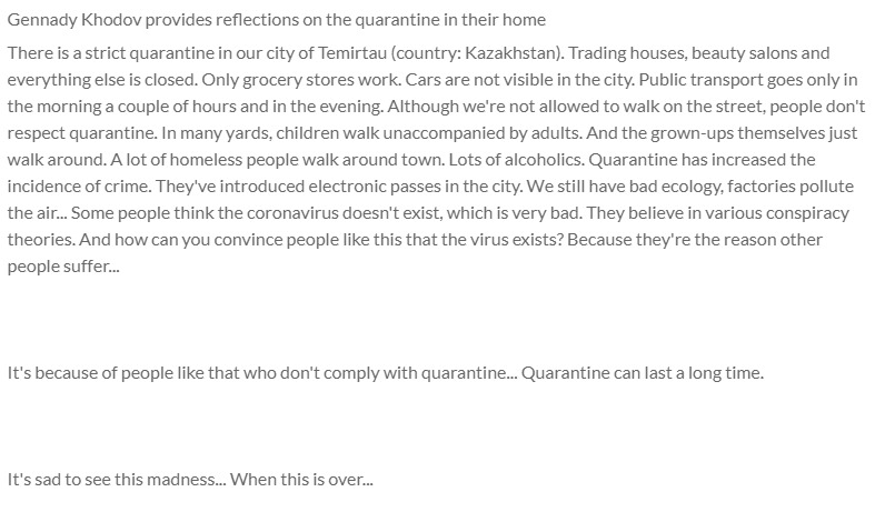 There is a strict quarantine in our city of Temirtau (country: Kazakhstan). Trading houses, beauty salons and everything else is closed. Only grocery stores work. Cars are not visible in the city. Public transport goes only in the morning a couple of hours and in the evening. Although we're not allowed to walk on the street, people don't respect quarantine. In many yards, children walk unaccompanied by adults. And the grown-ups themselves just walk around. A lot of homeless people walk around town. Lots of alcoholics. Quarantine has increased the incidence of crime. They've introduced electronic passes in the city. We still have bad ecology, factories pollute the air... Some people think the coronavirus doesn't exist, which is very bad. They believe in various conspiracy theories. And how can you convince people like this that the virus exists? Because they're the reason other people suffer...