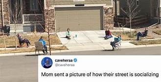 The screenshot is of a Twiiter post which features a group of friends sitting several feet apart from each other in their neighborhood. It shows us the change the pandemic has made on our relationships with each other and how we communicate and socialize.
