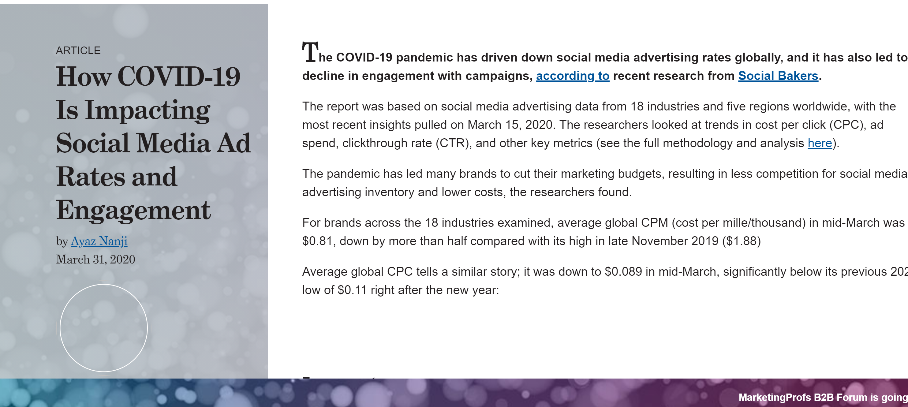 Article about the impact of COVID 19 on social media advertisement. The pandemic has had the effect of driving down ad rates globally, alongside a decline in engagement with ad campaigns.