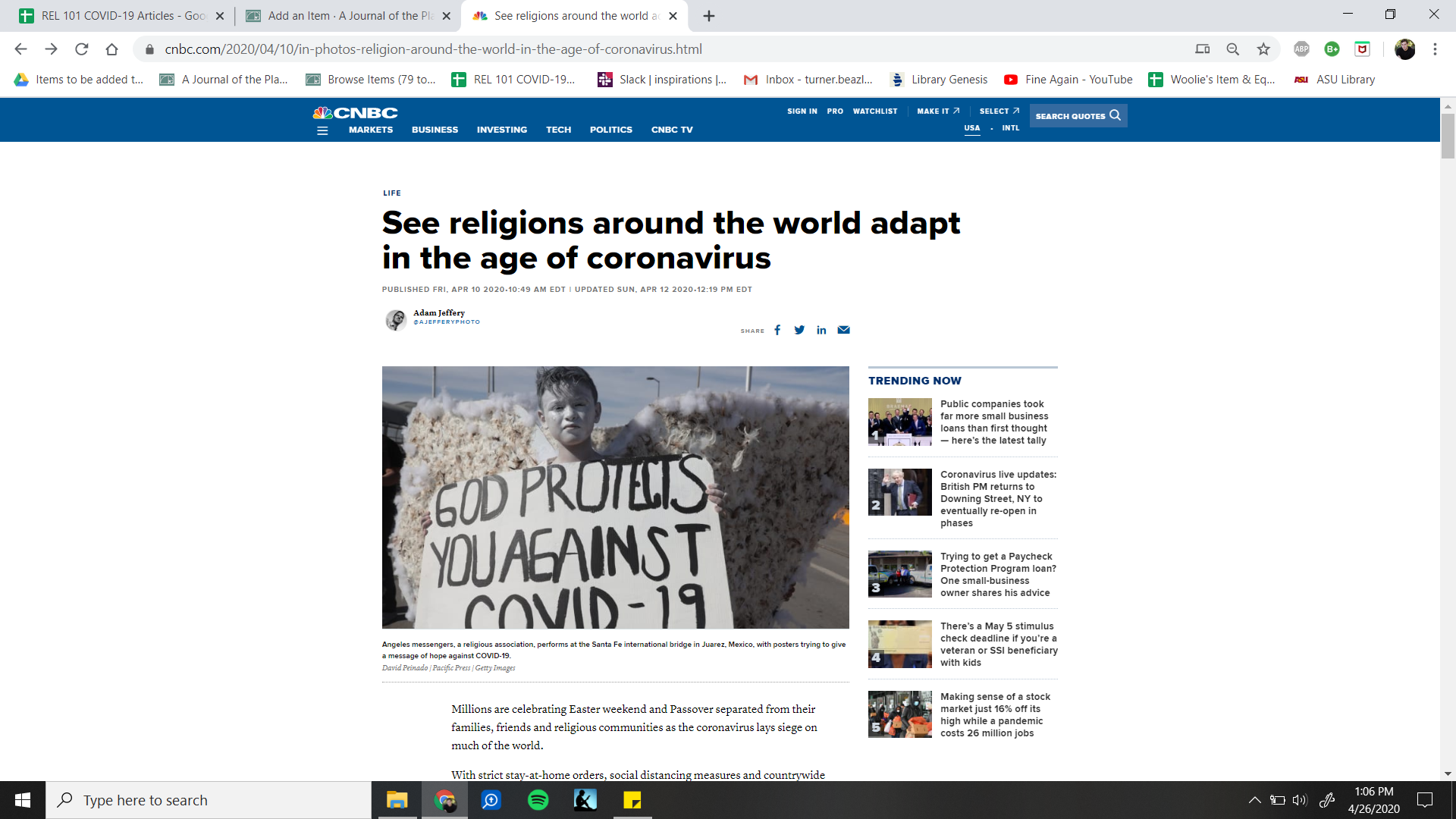 Due to the mayhem following the coronavirus pandemic that has been occurring worldwide, “religious leaders have had to find creative ways to bring their services and communities together” according to Adam Jeffery with the CNBC. Throughout the article, Jeffrey displayed how all around the world religious leaders have thought of very innovative ways to keep their followers still involved in the church and to try to keep communities as together as possible. In Austria, the catholic priest Johannes Laichner is “circulating incense over the photographs of members of his congregation” (Jeffery, 2020). In places like Bowie, Maryland, Rv. Scott Holmer risks his life to go outside and “make the sign of a cross while holding confession in the church parking lot” (Jeffery, 2020). In Israel, Ultra-Orthodoc Jews still show their faithfulness to their house of worship as they “pray along a street outside their closed synagogue while respecting the social distancing regulations'' (Jeffery, 2020). Places all over the world are still keeping their faith in the higher power they believe in during such a sad and crazy time that we’re living in. Both the people as well as the religious leaders all around are displaying their support for each other in various ways to convey the message that regardless of what may be going on in the world, the higher power is still the answer and we’re in this together.