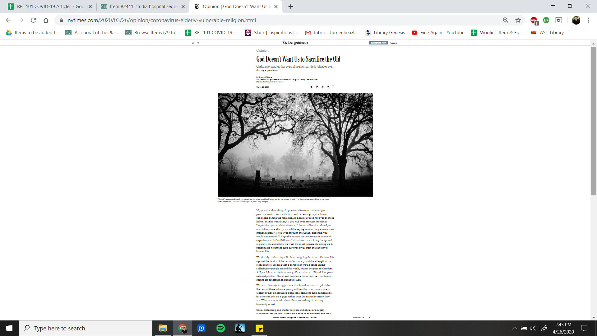 This article was written by Rusell Moore, the president of the Ethics and Religious Liberty Commission of the Southern Baptist Convention. in this article is stated to learn during this pandemic not only the survival but to also focus on other than yourself. people are suffereing because the pandemic has not hit a certain wealth status but over all, rich poor, young or old families or inviduals. Moore suggested to take away from this pandemic how to love your neighbours as yourself. also she reminds us that every life is vulnerable at this time not only us.