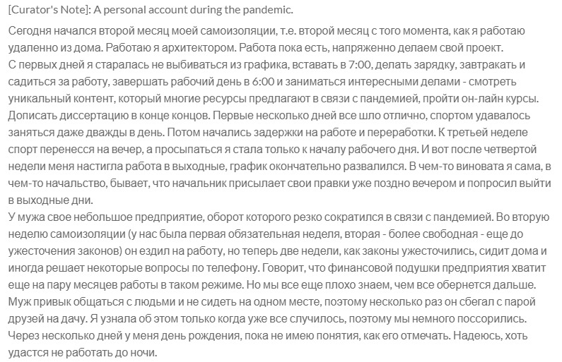 У мужа свое небольшое предприятие, оборот которого резко сократился в связи с пандемией. Во вторую неделю самоизоляции (у нас была первая обязательная неделя, вторая - более свободная - еще до ужесточения законов) он ездил на работу, но теперь две недели, как законы ужесточились, сидит дома и иногда решает некоторые вопросы по телефону. Говорит, что финансовой подушки предприятия хватит еще на пару месяцев работы в таком режиме. Но мы все еще плохо знаем, чем все обернется дальше. Муж привык общаться с людьми и не сидеть на одном месте, поэтому несколько раз он сбегал с парой друзей на дачу. Я узнала об этом только когда уже все случилось, поэтому мы немного поссорились. Через несколько дней у меня день рождения, пока не имею понятия, как его отмечать. Надеюсь, хоть удастся не работать до ночи.