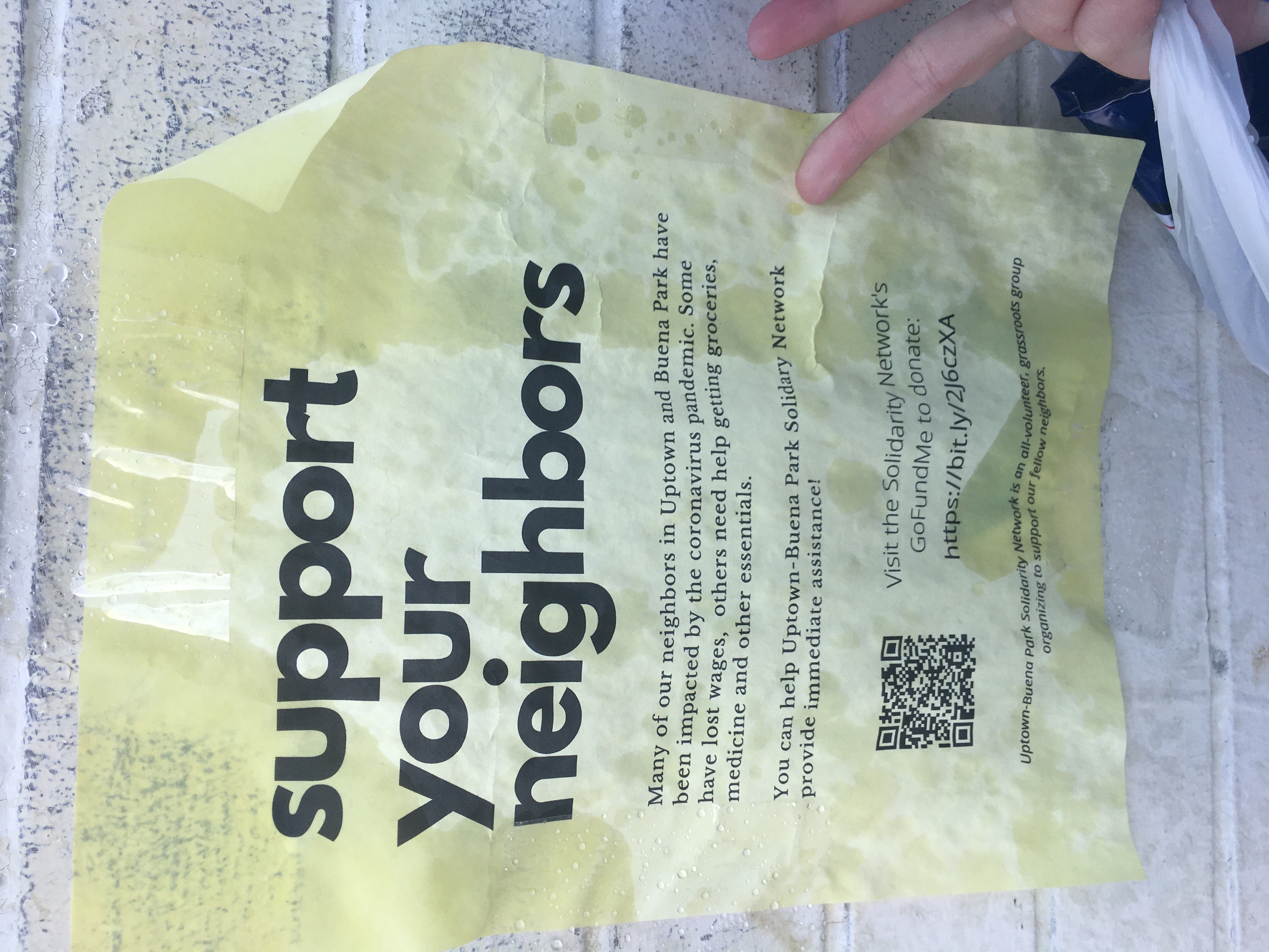 This is a photograph of a flyer posted on the side of a Hispanic grocery store at the end of my street in Northside Chicago on my way back from a quick grocery trip. This GoFundMe was created March 20th by members of the Uptown Buena Park Solidarity Network. The Uptown and Buena Park areas are home to older people, people out of homes, migrants of many countries and cultures, and more recently, young working professionals. The UBP Solidarity Network Twitter bio says they are, “an all-volunteer, grassroots group operating in Chicago's Uptown and Buena Park neighborhoods.” They set up Google forms for people in need to request groceries, bill payments or help being sheltered. Although they only exist on social media, they use physical signs because they do not want to leave out the members of the community who are most vulnerable at this time. Their social media provide links to forms where people can request help from older citizen care, grocery runs and helping with bill payments. #DePaulHST391