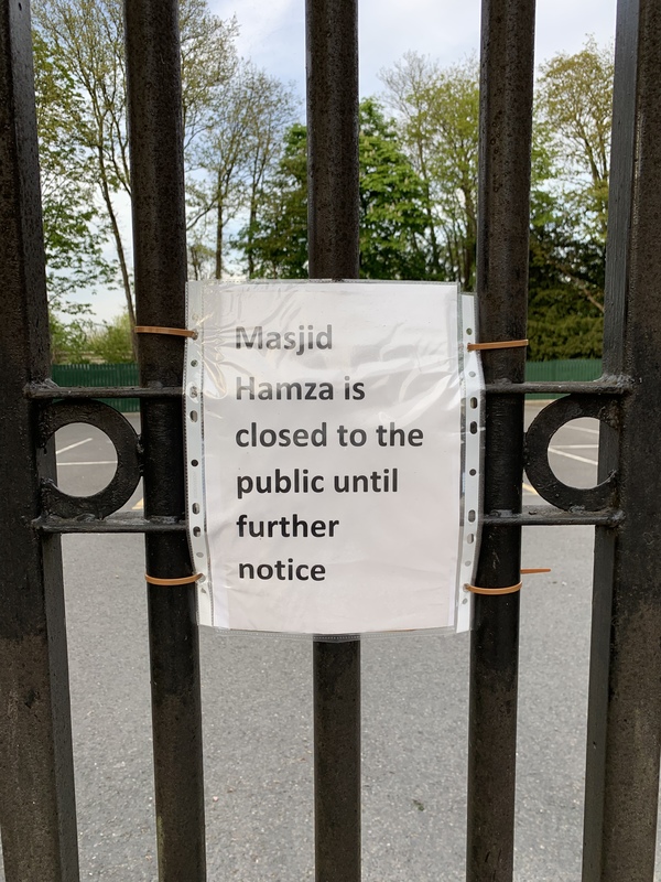 This is a sign announcing the closure of the mosque Masjid Hamza, a normally bustling cultural and community center between Balsall Heath and Moseley in Birmingham, England.