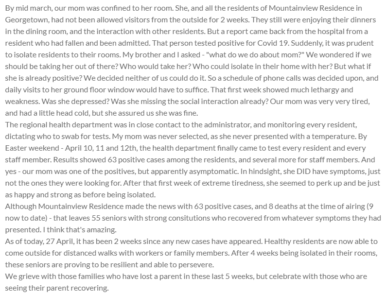 Although Mountainview Residence made the news with 63 positive cases, and 8 deaths at the time of airing (9 now to date) - that leaves 55 seniors with strong consitutions who recovered from whatever symptoms they had presented. I think that's amazing.