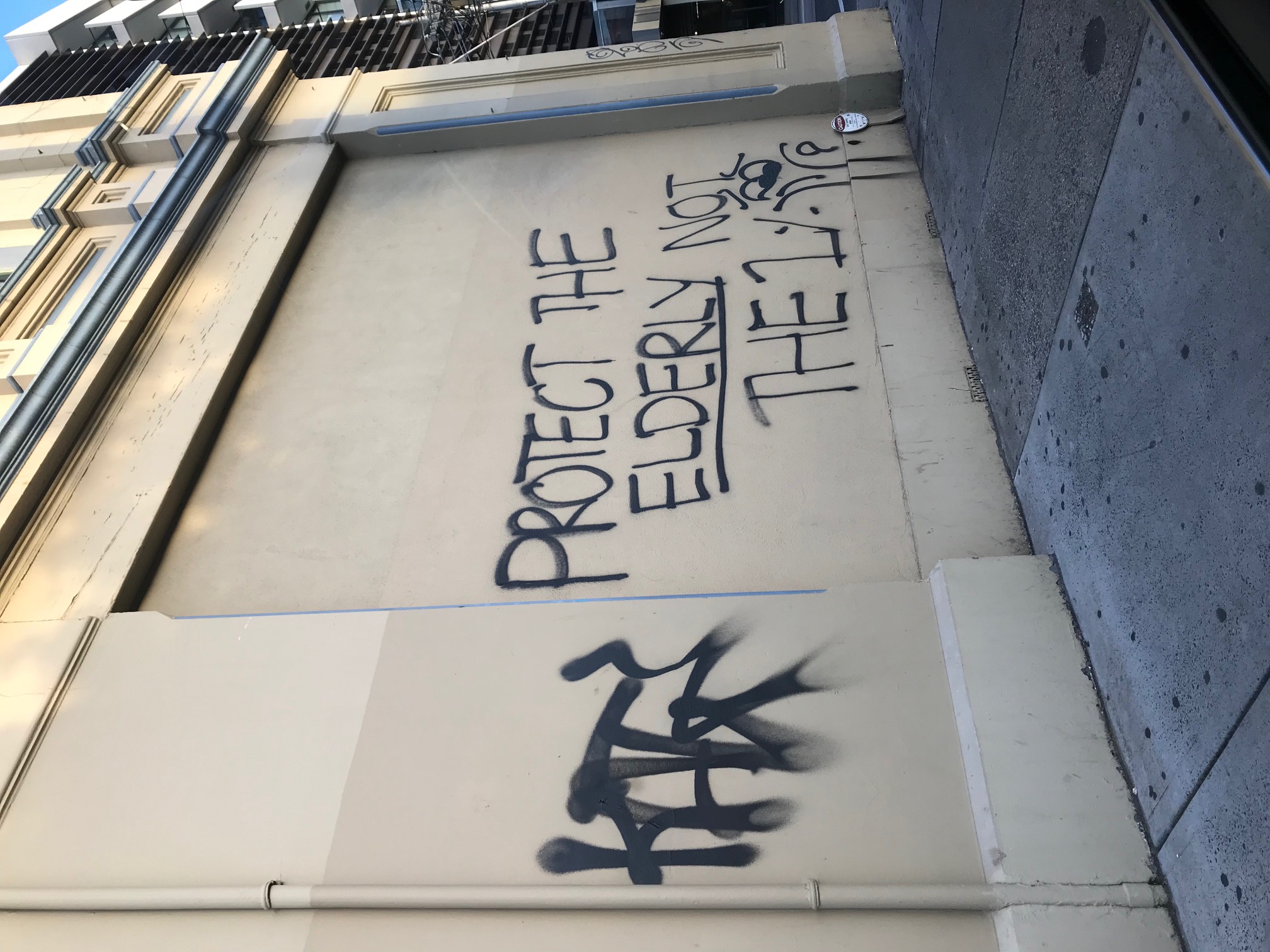 This graffiti went up in April inext to the Prahran Market, Stonnington, one of the areas in Melbourne with the highest count of Covid cases, which is also very affluent.