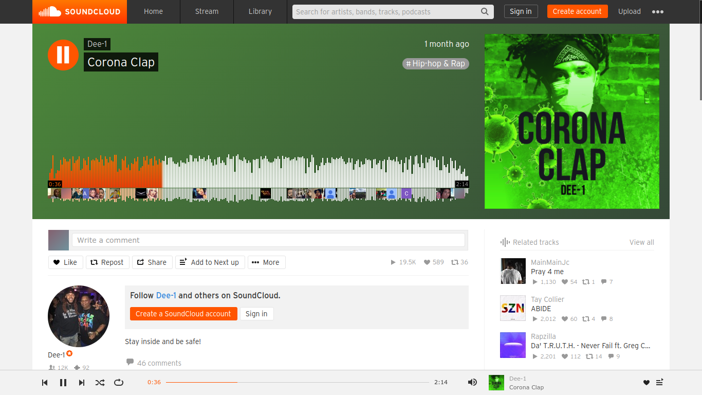 New Orleans rapper Dee-1 released the song "Corona Clap," a remix of the New Orleans classic "Nolia Clap" by UTP (rappers Juvenile, Wacko and Skip) in March 2020. Lyrics include references to handwashing, cheap flights, NBA cancellations, school and church closures, and toilet paper shortages. The song includes a sound bite from New Orleans Mayor Latoya Cantrell.