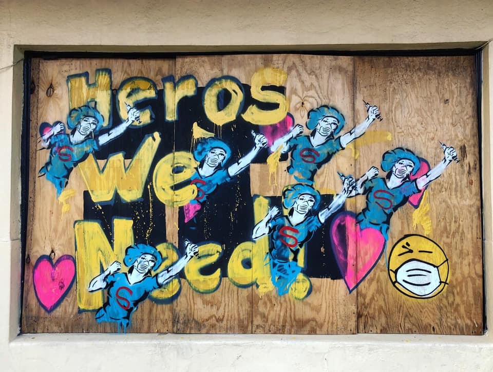 Medical professionals with masks, hairnets, gloves, and syringes spray-painted on boarded-up doors on Frenchmen Street in New Orleans. Businesses along Frenchmen and throughout the French Quarter boarded up their doors and windows at the beginning of the COVID-19 stay-at-home-order.