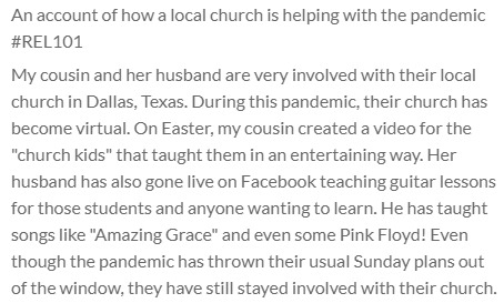 My cousin and her husband are very involved with their local church in Dallas, Texas. During this pandemic, their church has become virtual. On Easter, my cousin created a video for the "church kids" that taught them in an entertaining way. Her husband has also gone live on Facebook teaching guitar lessons for those students and anyone wanting to learn. He has taught songs like "Amazing Grace" and even some Pink Floyd! Even though the pandemic has thrown their usual Sunday plans out of the window, they have still stayed involved with their church.