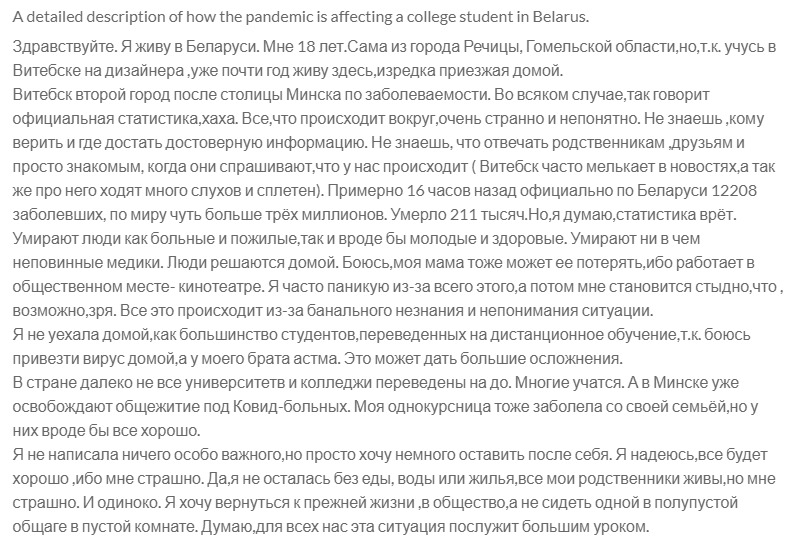 Я не написала ничего особо важного,но просто хочу немного оставить после себя. Я надеюсь,все будет хорошо ,ибо мне страшно. Да,я не осталась без еды, воды или жилья,все мои родственники живы,но мне страшно. И одиноко. Я хочу вернуться к прежней жизни ,в общество,а не сидеть одной в полупустой общаге в пустой комнате. Думаю,для всех нас эта ситуация послужит большим уроком.