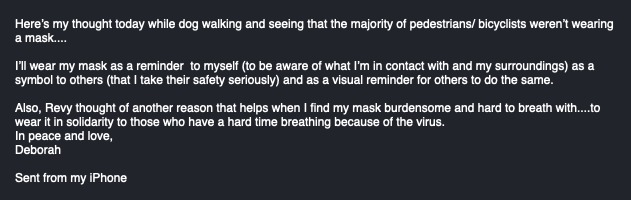 An email sent from one neighbor to a group living in an intentional living community describing why she wears her mask after a difficult conversation about regulating shared spaces.