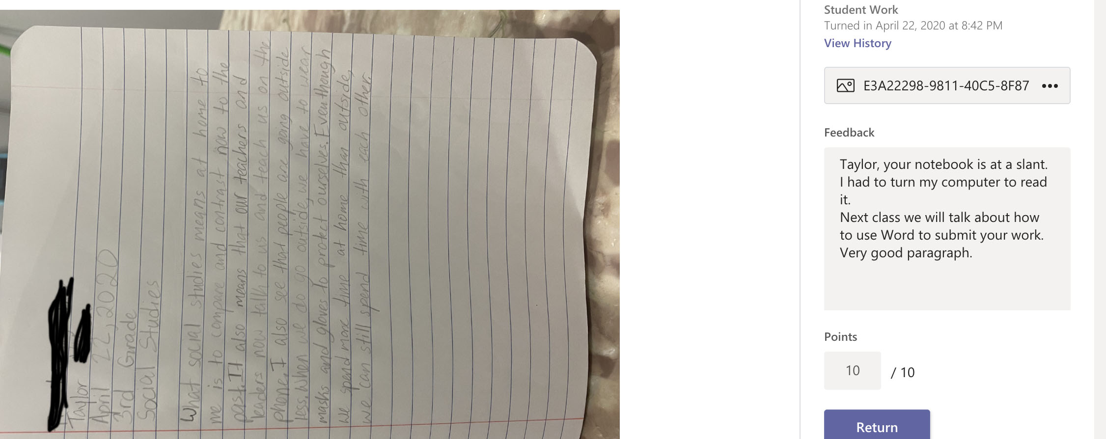 This image is apart of a series of screenshots taken during lessons via Microsoft Teams.Teaching my third graders from afar has become a challenge and a blessing at the same time. None of us knew of Mr. Microsoft Teams until we were forced to meet him. The way he impacts our lives is sometimes frustrating and other times satisfying. (I've redacted the name to protect the student's privacy.)