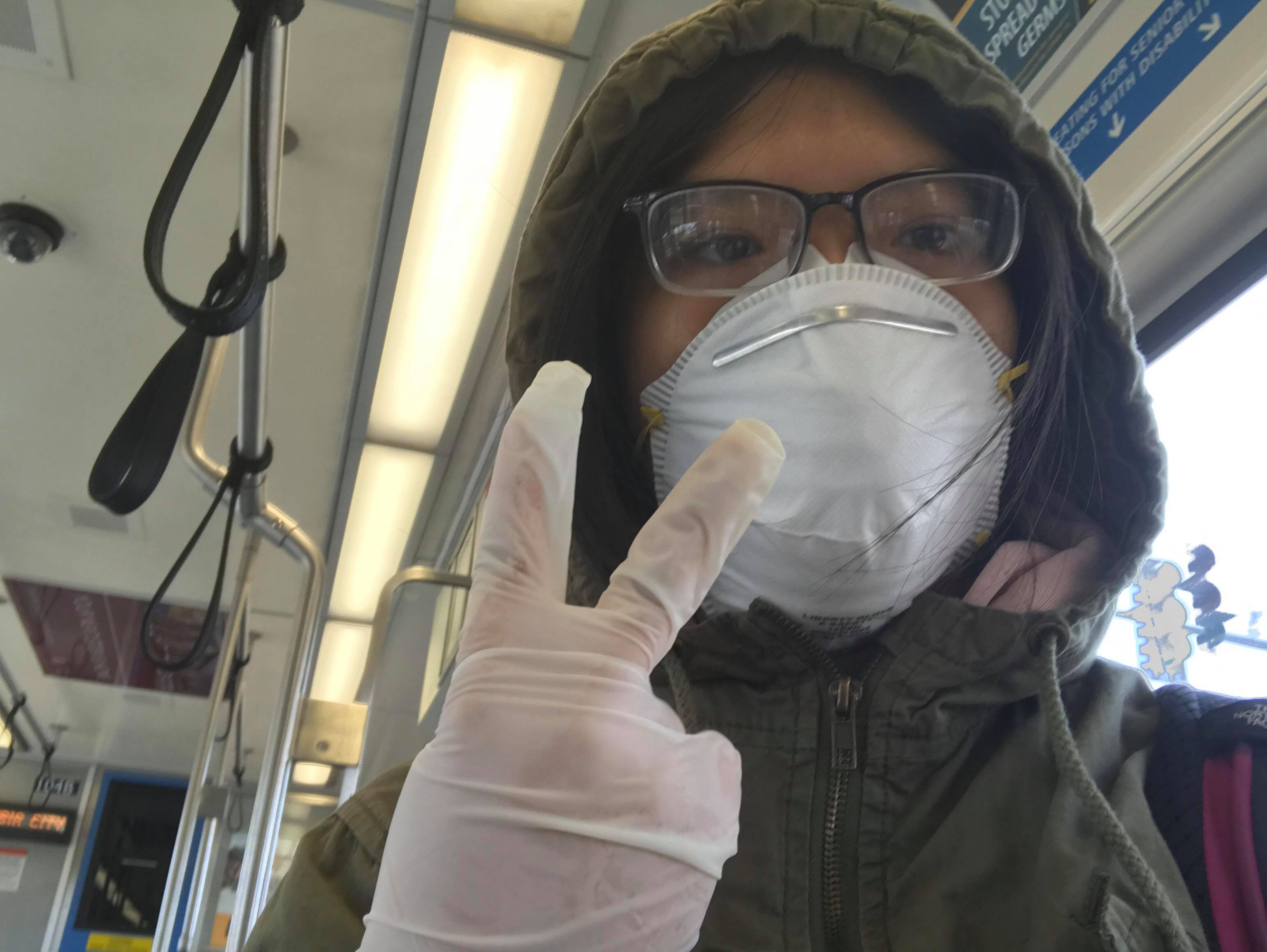 The image was taken when I finally arrived at SeaTac airport in Washington at 11:00 A.M on March 22, 2020. Because my parents scared that Uber drivers are easier to be exposed to the COVID-19 virus and it would be more dangerous for me to sit near them, my mother told me to catch the public train instead. It was definitely the right choice because due to a huge number of infected people in WA, everyone is afraid to take public transportation so it was only me in that entire train's section. To be extremely careful, I also wear a mask, gloves, tie my hair, and cover my head so that I am less exposed myself to the air.