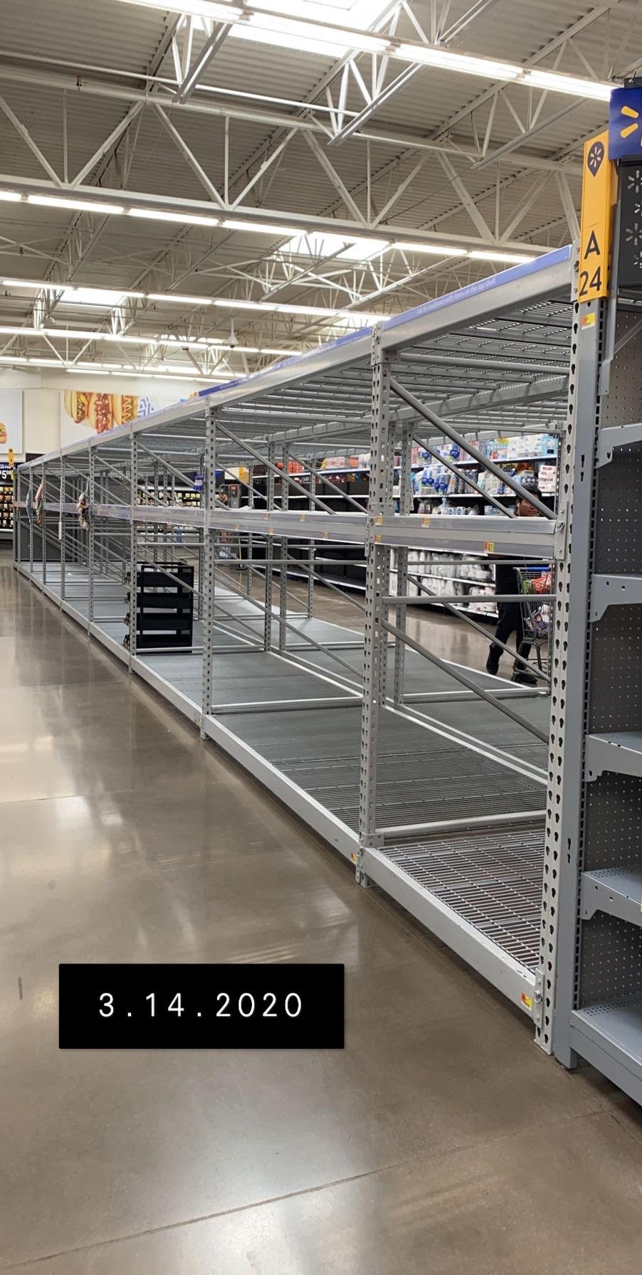 Walmart, which is usually known for having large quantities of any and all goods you could ever need, is shown being completely out of toilet paper. It shows the reality of this pandemic, and the obsession to "horde" what is seen as neccesities. Not pictured is the meat section completely empty, as well as all the bicycles being sold out, both of which were the case on different occasions. #REL101