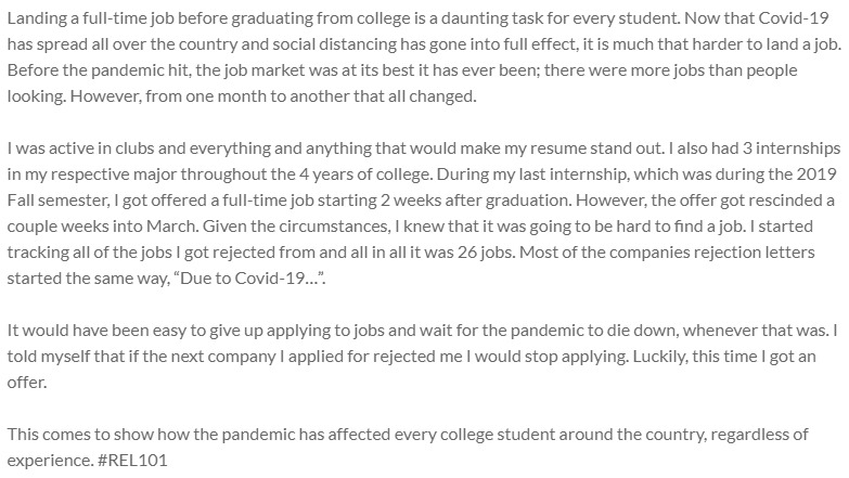 This comes to show how the pandemic has affected every college student around the country, regardless of experience. #REL101