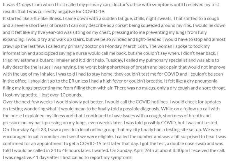 It was 41 days from when I first called my primary care doctor’s office with symptoms until I received my test results that I was currently negative for COVID-19.