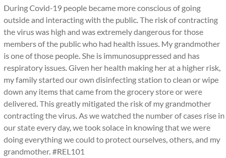 During Covid-19 people became more conscious of going outside and interacting with the public. The risk of contracting the virus was high and was extremely dangerous for those members of the public who had health issues. My grandmother is one of those people. She is immunosuppressed and has respiratory issues. Given her health making her at a higher risk, my family started our own disinfecting station to clean or wipe down any items that came from the grocery store or were delivered. This greatly mitigated the risk of my grandmother contracting the virus. As we watched the number of cases rise in our state every day, we took solace in knowing that we were doing everything we could to protect ourselves, others, and my grandmother. #REL101