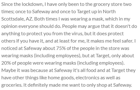 Since the lockdown, I have only been to the grocery store two times; once to Safeway and once to Target up in North Scottsdale, AZ. Both times I was wearing a mask, which in my opinion everyone should do. People may argue that it doesn't do anything to protect you from the virus, but it does protect others if you have it, and at least for me, it makes me feel safer. I noticed at Safeway about 75% of the people in the store was wearing masks (including employees), but at Target, only about 20% of people were wearing masks (including employees). Maybe it was because at Safeway it's all food and at Target they have other things like home goods, electronics as well as groceries. It definitely made me want to only shop at Safeway.