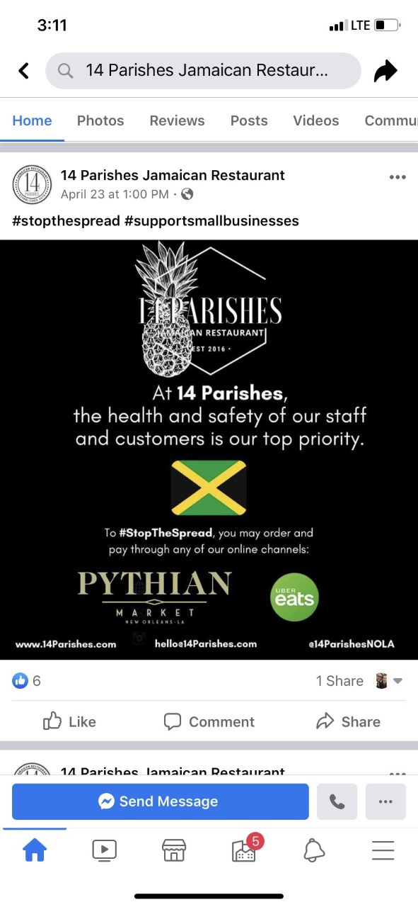 14 Parishes Jamaican Restaurant Promotes Stopping the Spread and Supporting Small Businesses, New Orleans, LA